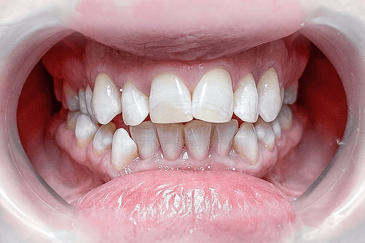 До нас у клініку звернулась пацієнтка зі скаргою на зубний ряд для його корекції. Її бажанням було встановити білосніжні зубні коронки або вініри. Після проведеного огляду та діагностики, запропонували пацієнтці вирівняти зубний ряд брекетами, щоб уникнути значного зняття тканин зуба при препарації через суттєве порушення зубного ряду. Від брекетів пацієнтка відмовилась через неестетичність методу.