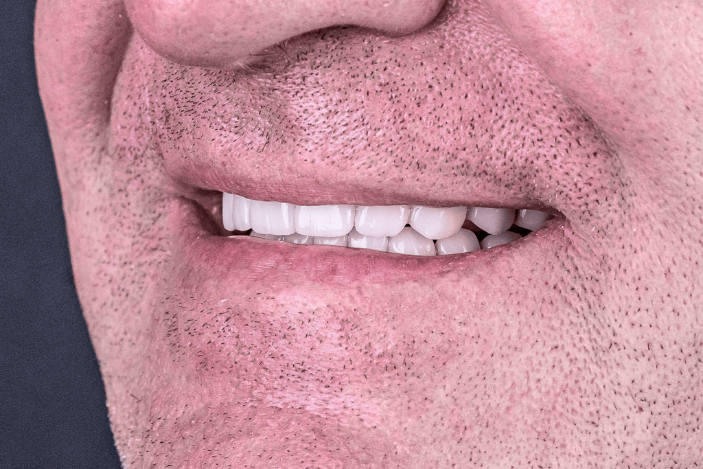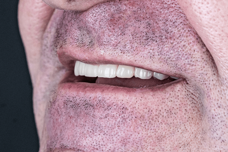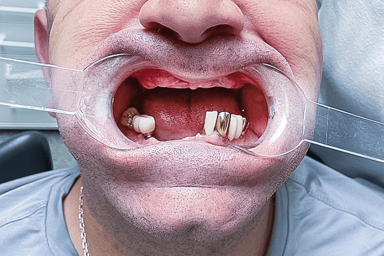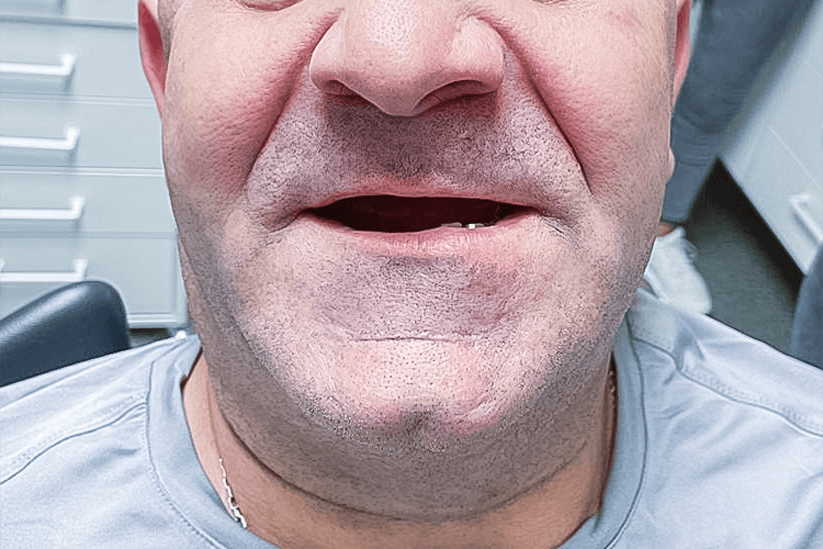 До нас звернувся пацієнт 1971 року народження зі скаргами на повну адентію верхньої щелепи та множинну адентію нижньої щелепи (від п’ятого зуба справа до другого зуба зліва), а також на рухомість мостовидного протезу нижньої щелепи, який покривав зуби 3, 4, 5 та 6 з лівого боку. Головна проблема для пацієнта — неможливість пережовування їжі та естетичний дефект.