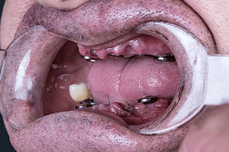 Під час огляду та діагностики нижньої щелепи було виявлено захворювання тканин пародонту в області опорних зубів мостоподібного протезу, 2 імплантати виробництва Південної Кореї з правого боку в області зубів 5 та 6, а також, ретинований "зуб мудрості" з правого боку. Додатково, пацієнт повідомив що не може використовувати знімні протези через посилений блювотний рефлекс та загальний дискомфорт в експлуатації подібних конструкцій.
