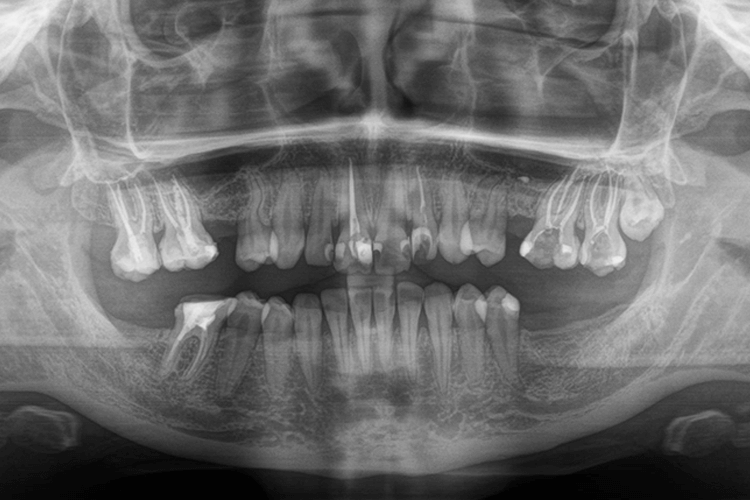 Оскільки зуби були втрачені досить давно (2 роки тому), відбулись анатомічні зміни будови щелеп, а антагоністи відсутніх зубів висунулись вниз. Було запропоновано повернути їх в оклюзію (змикання) за допомогою брекет-системи, але термін такого лікування не влаштовував пацієнтку, тож цей план лікування далі ми не розвивали. Тоді запропонували депульпувати верхні зуби з обох боків та вкрити коронками, тобто виправити прикус ортопедичним методом.
