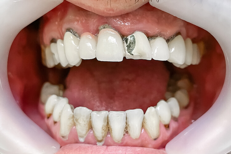 На верхней челюсти металлокерамическая конструкция (мост) со сколами керамики. Со слов пациента после травм. На нижней челюсти жевательные зубы с большими кариозными полостями и отсутствующие шестые зубы, большое количество зубов с пришеечным кариесом.