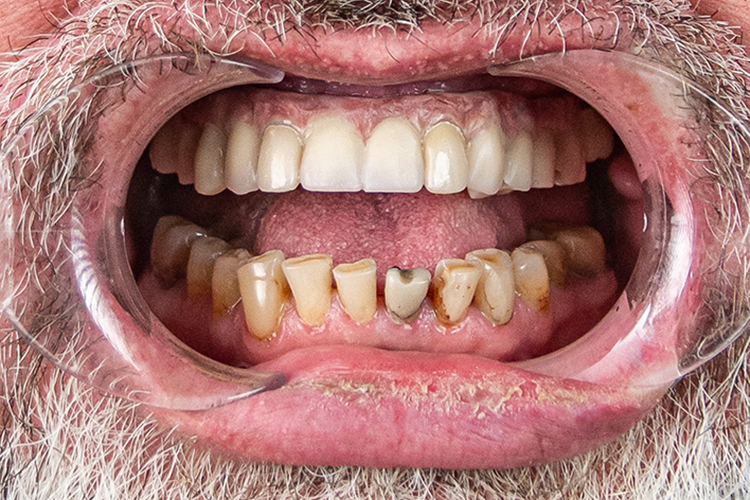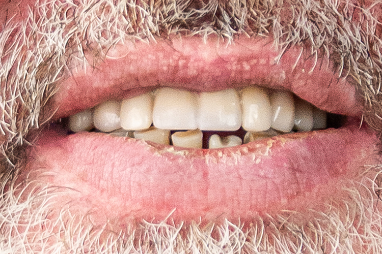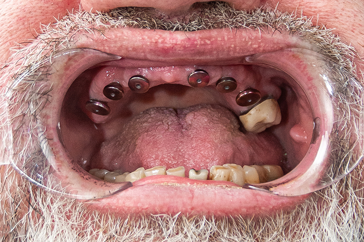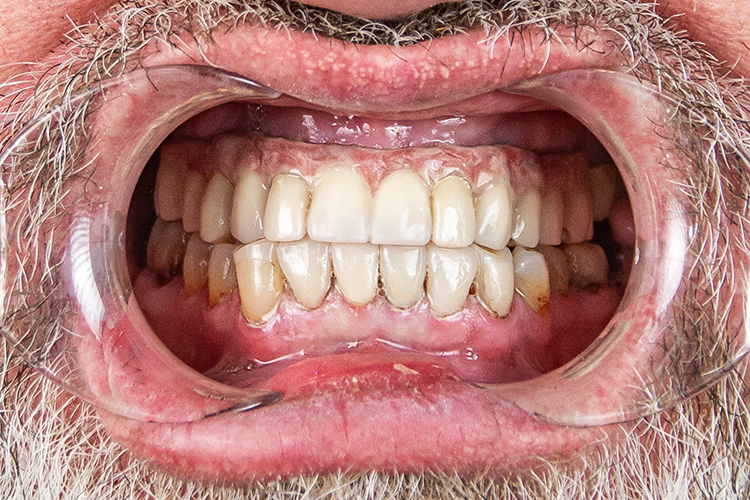 До визита в клинику пациент использовал съемные протезы, но они его не устраивали в плане комфорта, эстетики, а главное — часто ломались и он был вынужден ждать по 2 недели изготовления нового протеза.