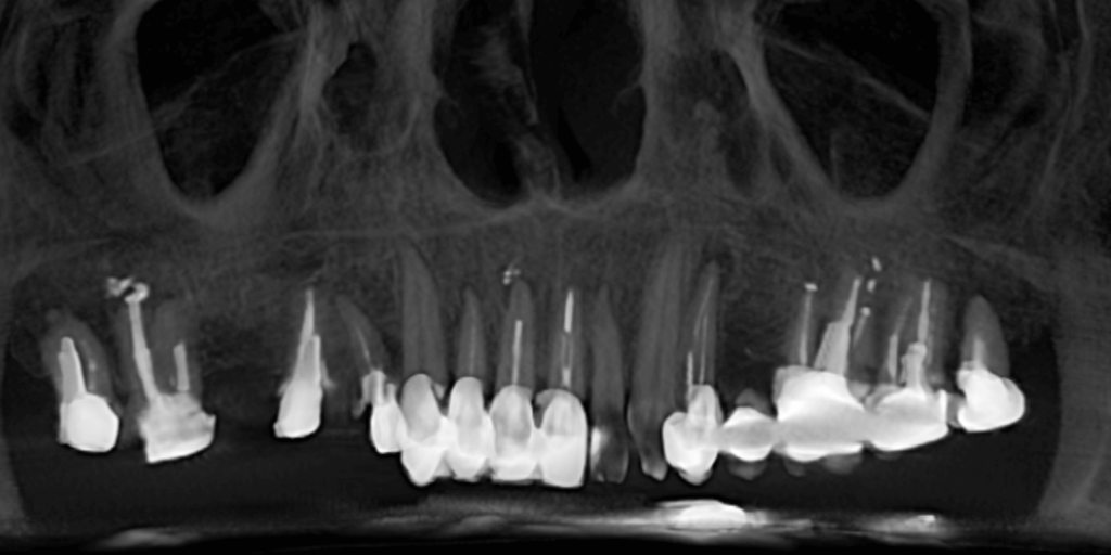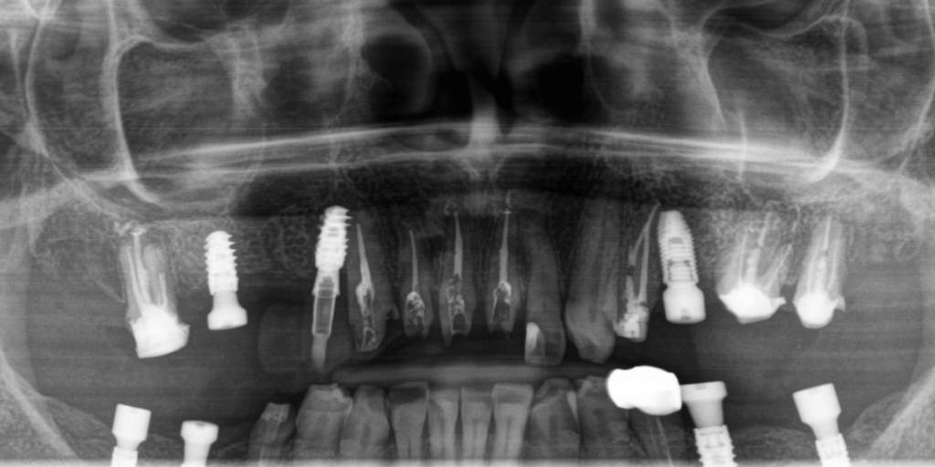 На верхней челюсти снять мостовидные протезы и удалить 4 зуба. Выполнить повторное лечение корневых каналов ("реэндо"). Также установить импланты Straumann BLX.