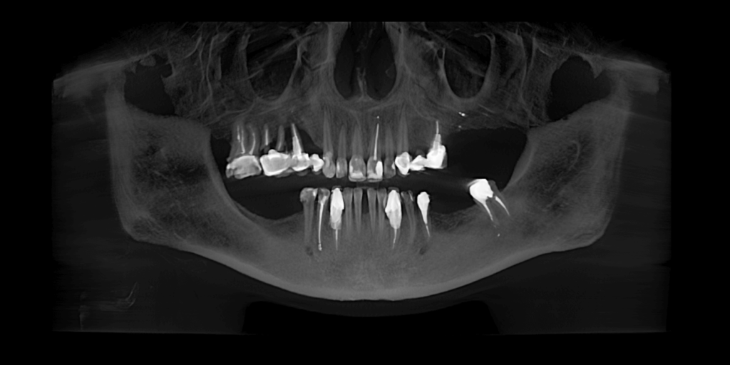 После осмотра врач направил пациентку на 3D КТ-исследование обеих челюстей, чтобы полноценно оценить состояние зубов и предложить обоснованный план лечения. На КТ был выявлен раскол корней зубов под мостовидным протезом на зубах 1.4-1.6.