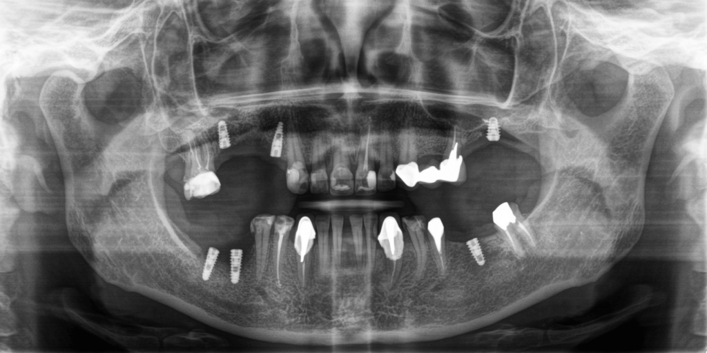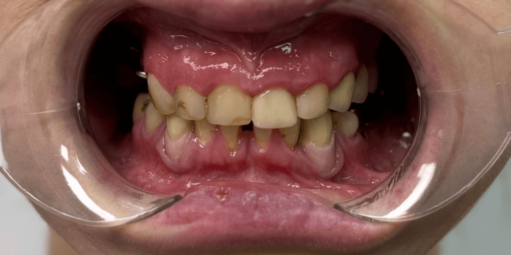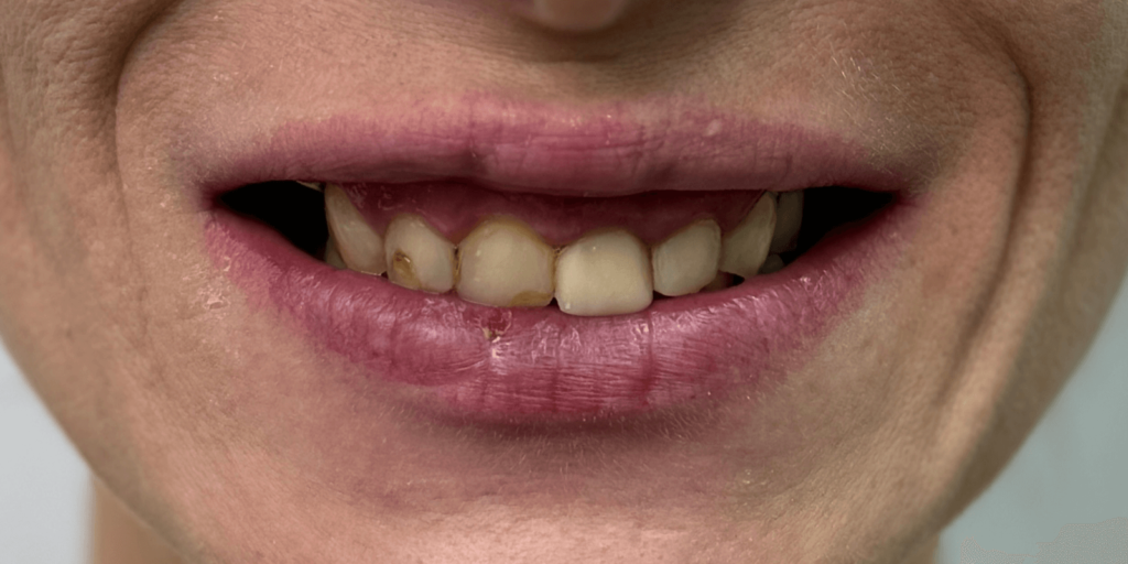 В нашу клинику обратилась женщина с многолетней усталостью в глазах. Она не могла нормально пережевывать пищу, стеснялась своей улыбки и постоянно подсознательно прятала лицо во время разговора. Ее беспокоили не только эстетические проблемы — отсутствуют зубы, старые мостовидные протезы, потемневшие пломбы, — но и функциональный дискомфорт, каждый день напоминавший о себе. Во время первичного осмотра (визуально) врач увидел: