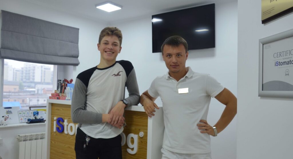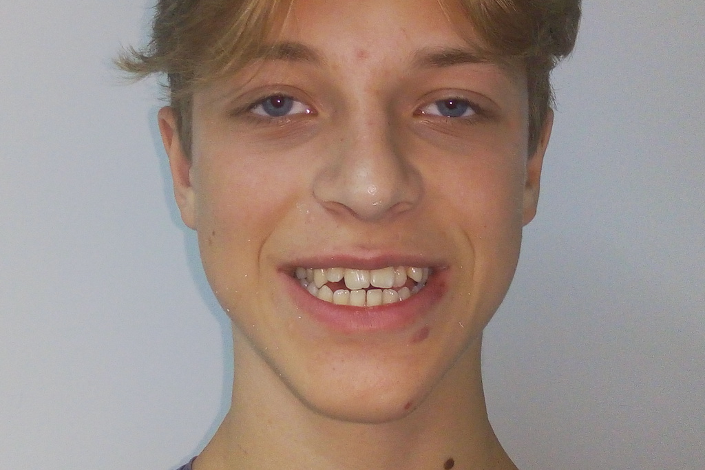 Родители молодого человека обратились в стоматологию Максима Макаренко с жалобами на неудовлетворительный эстетический вид улыбки (неровные зубы), а также на невозможность нормального откусывания пищи по причине несмыкания передних зубов и избыточного выдвижения нижней челюсти вперёд. Пациент пожелал выровнять зубной ряд, ввести все зубы в контакт для полноценного откусывания пищи, а также исправить смещенную центральную линию по резцам верхней и нижней челюсти, поскольку данный дефект визуально делал лицо ассиметричным.