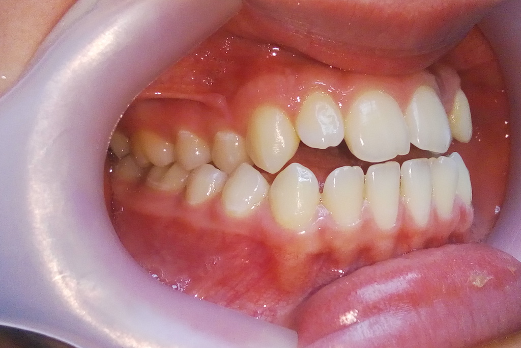 - перекрестный прикус справа, скученность зубов.