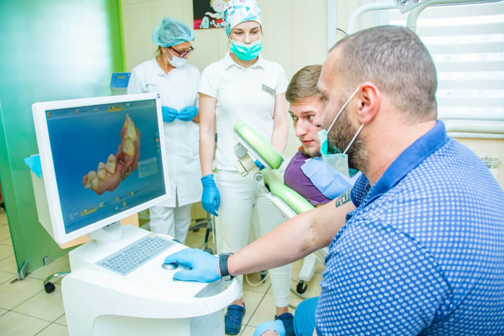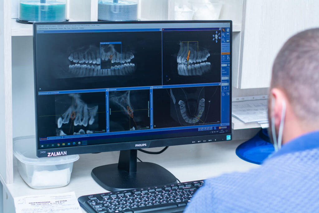 После КТ-исследования мы смогли увидеть то, что расстояние от клыка до 4-го зуба (где планируем ставить имплант) очень мало. Было принято решение провести установку импланта по шаблону.