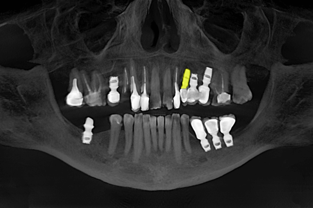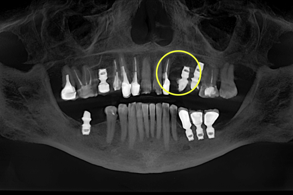 На КТ-снимке мы увидели, что один из имплантов слева на верхней челюсти не интегрировался в кость, был подвижным и спровоцировал воспалительный процесс в организме.