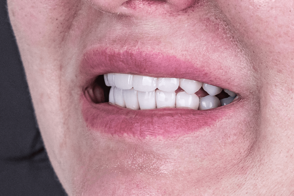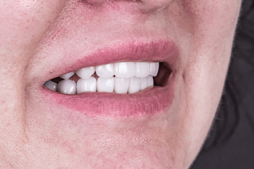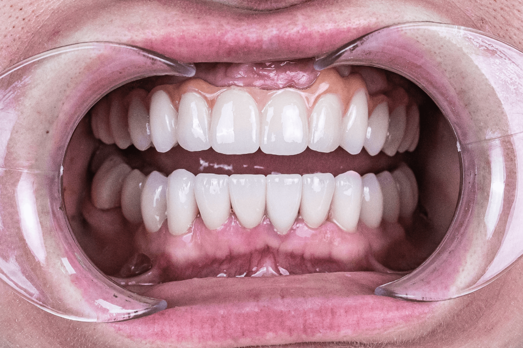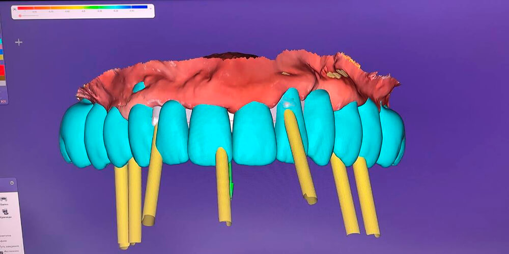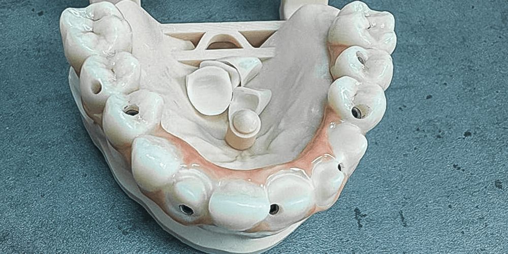 - Изготовить на верхнюю челюсть прикручиваемую цельнолитую конструкцию из диоксида циркония и закрепить ее на имплантах.