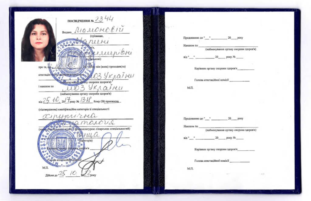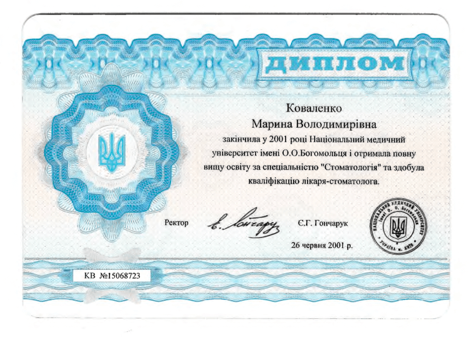 на базе Стоматологического медицинского центра Национального медицинского университета им. А. А. Богомольца, специальность «хирургическая стоматология»