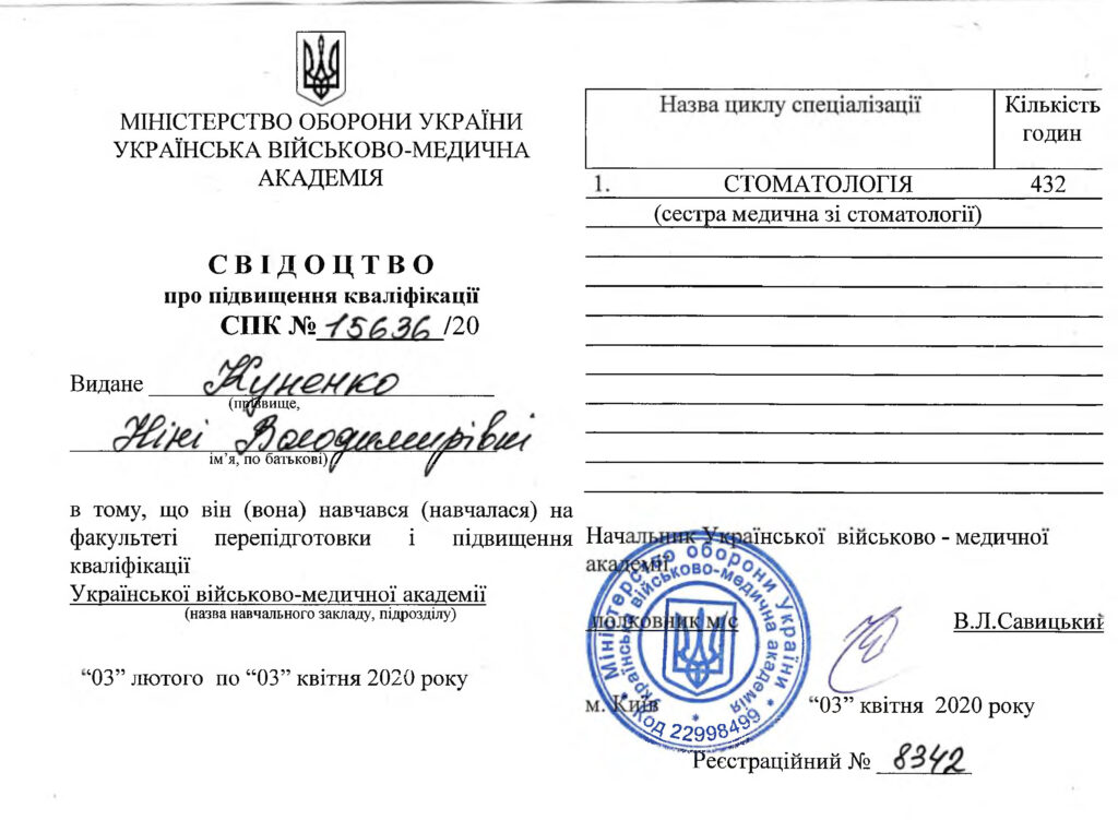 После окончания школы поступила в первый Киевского медицинский колледж, где училась лечебному делу и получила квалификацию фельдшер.
