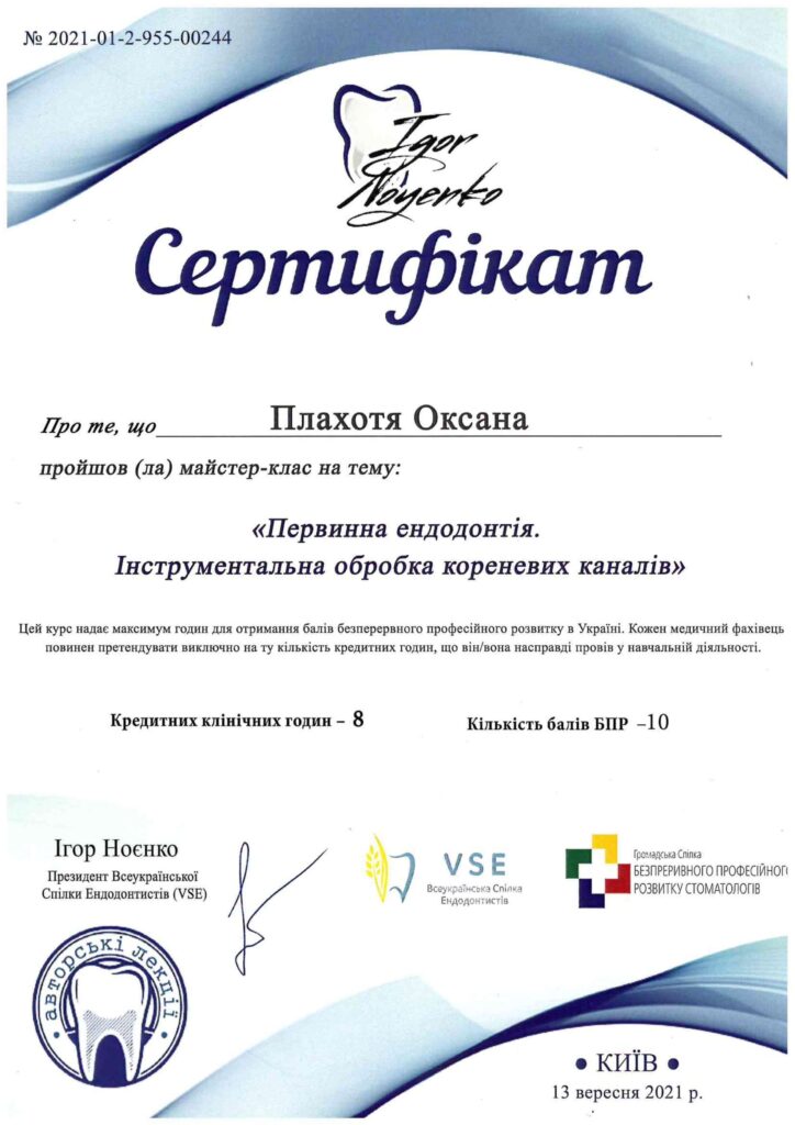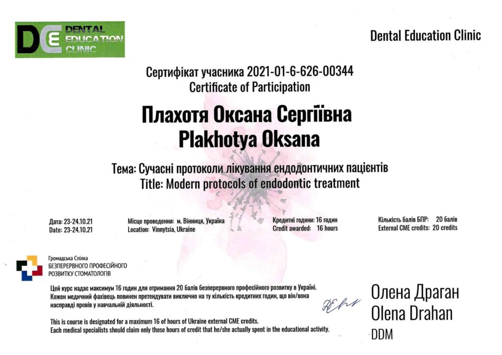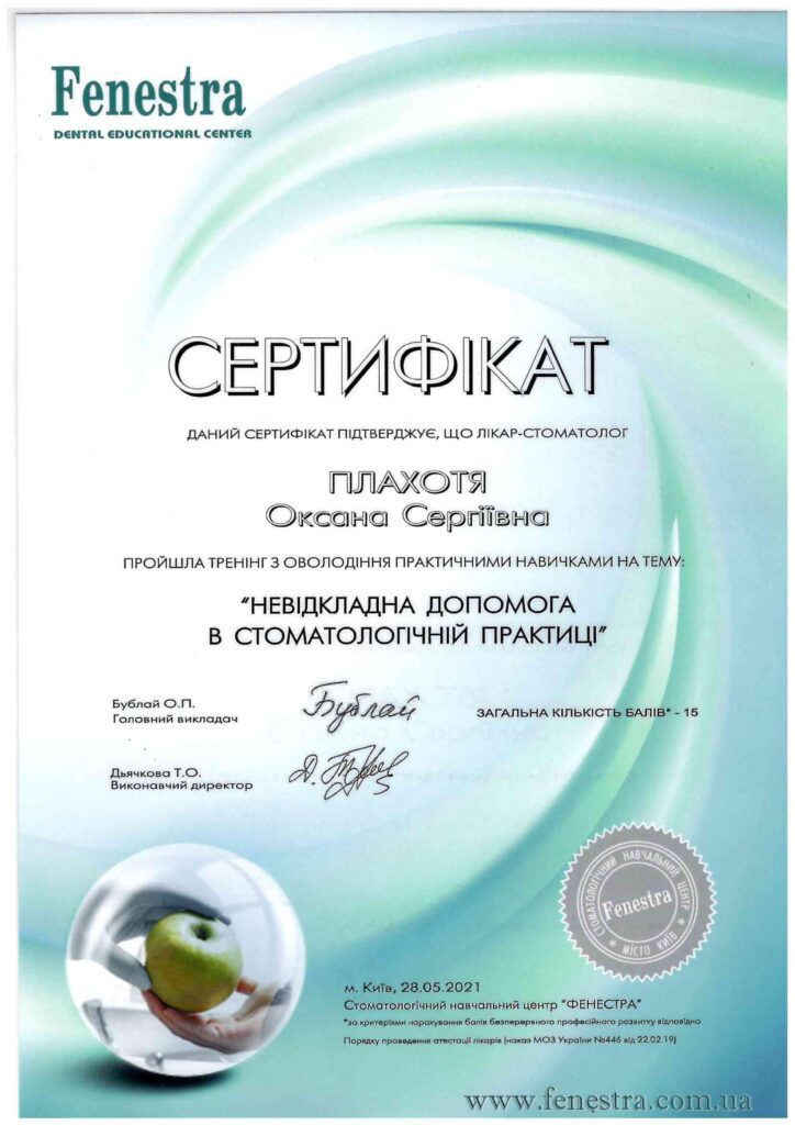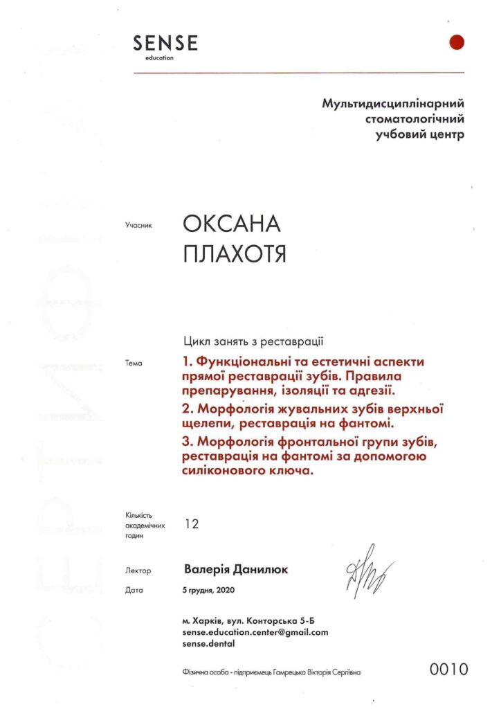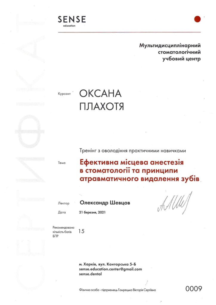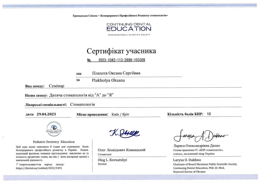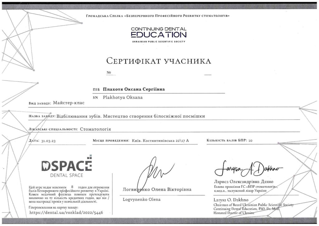 Окончила интернатуру на кафедре последипломного образования врачей-стоматологов на базе ПГМУ в городе Полтава