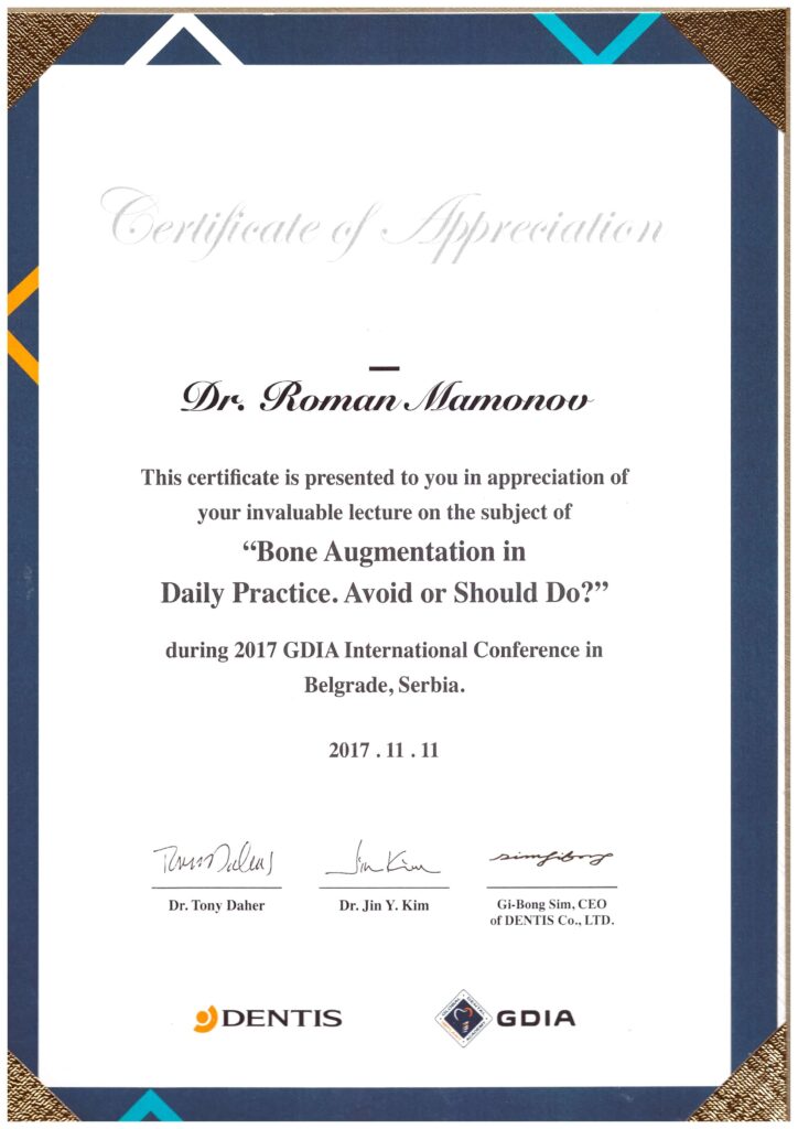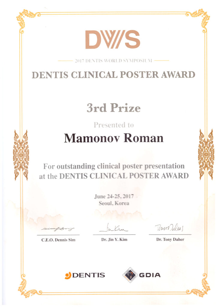занимает третье место с докладом по теме: "Реабилитация задней части верхней челюсти: Поднятие дна верхнечелюстной пазухи с одновременной установкой имплантата. 4-летнее наблюдение".