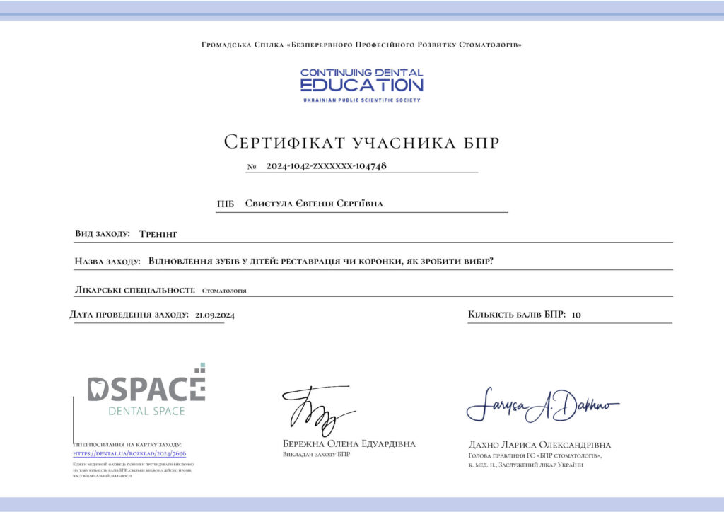Прошла тренинг "Восстановление зубов у детей: реставрации и коронки"