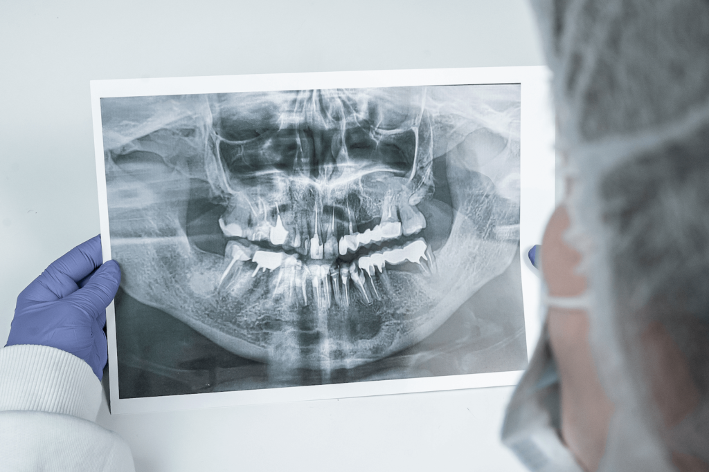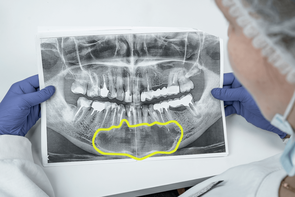 Около десяти лет назад к нашему врачу Максиму Макаренко обратилась пациентка с целью получить альтернативное мнение врача. Во время диагностики на панорамном снимке врач обнаружил интактные (здоровые) зубы на нижней челюсти и в области подбородка, в области апексов фронтальных зубов кисту с четким очертанием. Киста была достаточно большого размера, а именно от зуба 4.5 до зуба 3.5. То есть почти все зубы нижней челюсти были поражены новообразованием.