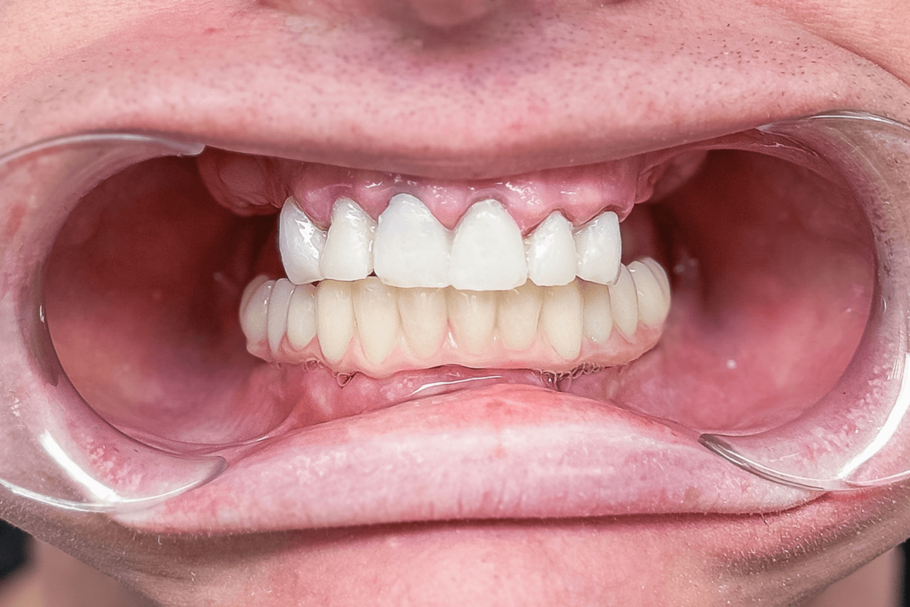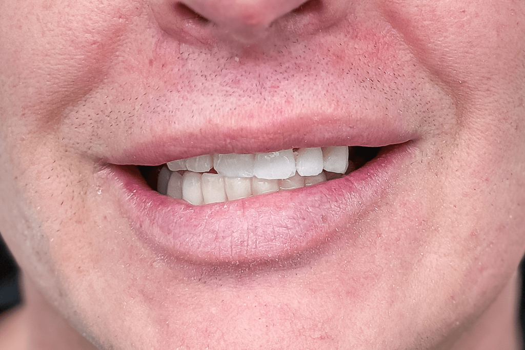 Через 5 дней пациенту сняли mock-up и приступили к фиксации постоянных ортопедических конструкций. Сделали 2 мостовидных протеза слева и справа на верхней челюсти с винтовой фиксацией и одиночные коронки с цементной фиксацией на зубах 13-23. На нижней челюсти врач зафиксировал сплошной мостовидный протез на фиксации винтовой из 12 единиц, усиленный титановой балкой и назначил дату следующего визита.