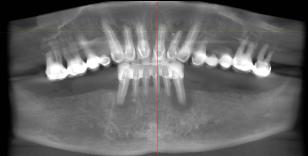 Пациенту сделали КТ-снимок и пригласили в кабинет врача. При осмотре были обнаружены металлокерамические мостовидные протезы справа и слева на верхней челюсти, а также на переднем участке нижней челюсти. Съемный протез на нижней челюсти, покрывавший участок жевательных зубов. Протез слева был подвижен вследствие подвижности опорных зубов первой степени на которых был зафиксирован.