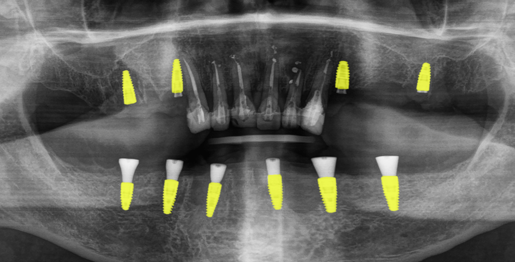 Через неделю пациента снова пригласили в клинику на контрольный осмотр. Дополнительно врач провел рентгенологическое исследование, на котором проследил как "села" конструкция и как спозиционировались абатменты в имплантах после нагрузки. Коррекция работы не потребовалась. После этого врач дал рекомендации по уходу, чтобы новые зубы прослужили пациенту как можно дольше: рекомендовалась профессиональная гигиена полости рта дважды в год, использование ирригатора в домашних условиях, контрольный рентген ежегодно.