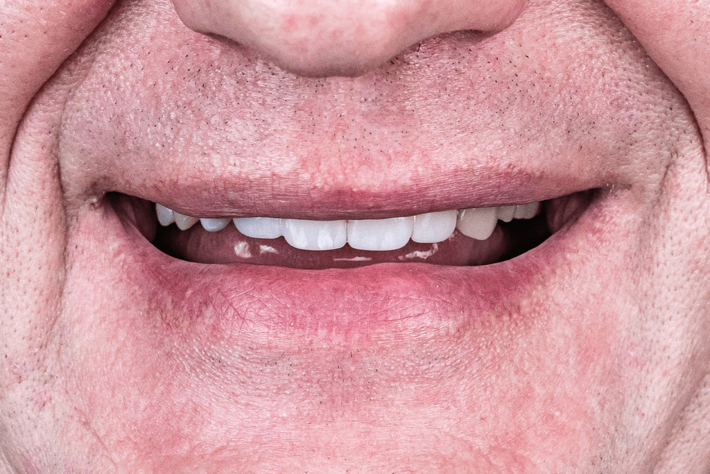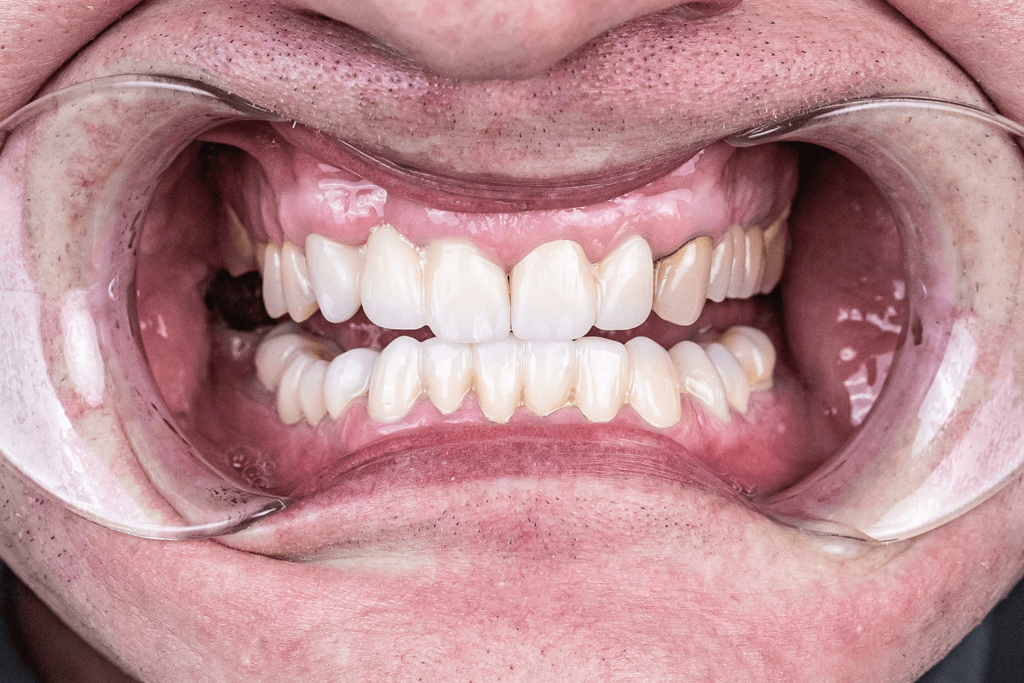 На основе ранее полученной модели были изготовлены единичные коронки и мостовидные протезы из диоксида циркония. За одно посещение сняли временные конструкции и зафиксировали постоянные как на родных зубах, так и на зубных имплантах.
