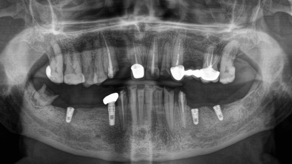 При осмотре пациента было обнаружено отсутствие восьми зубов: 5, 6, 7, 8 с правой и левой сторон на нижней челюсти. Нижние фронтальные зубы были поражены в результате патологического стирания вызванного массивной антагонистической конструкцией (металлокерамические коронки) на фронтальных зубах верхней челюсти. После 3D КТ-диагностики, осмотра и выслушав пожелания пациента, предложили следующий план лечения: